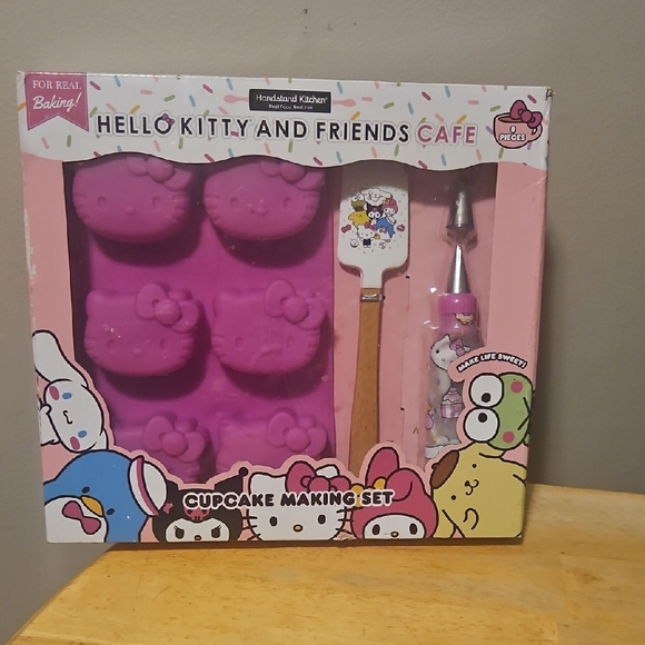 Pink Hello Kitty cupcake making set. Includes molds and decorating tools.