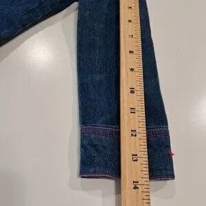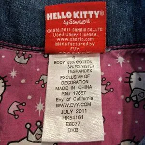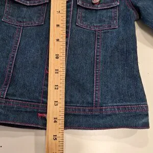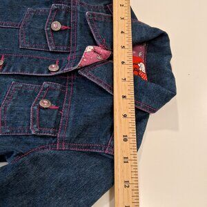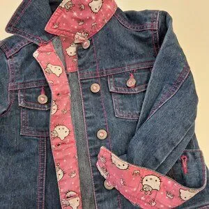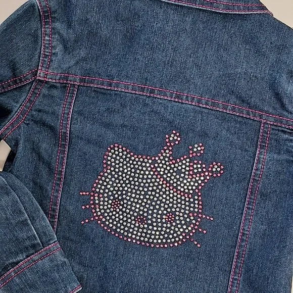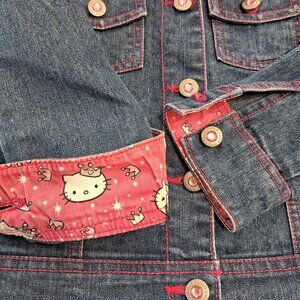 Hello Kitty denim jacket with pink fabric trim at the cuffs, button placket, and collar featuring a repeating Hello Kitty design. The back depicts Hello Kitty's head in pink and white rhinestones. All buttons have a pink glitter plastic center and the name Hello Kitty embossed on them.