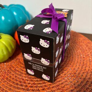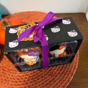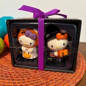 A super cute addition to your Halloween table top. Add this Hello Kitty 2 piece set to your Kawaii collection. Features two trick or treaters, one in a pumpkin costume and one in a witch costume, complete with black cat. Hand crafted and hand painted.