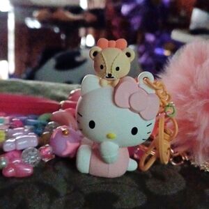 The Hello Kitty figure is stamped 'Hello Kitty '22 Sanrio Miniso' on the back of her head. I augmented the ketchain with special beads, chain, tassel, rocking horse, pink bell, dangling white teddy, pink puff pompom, etc.