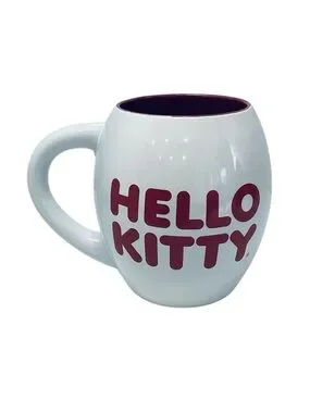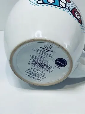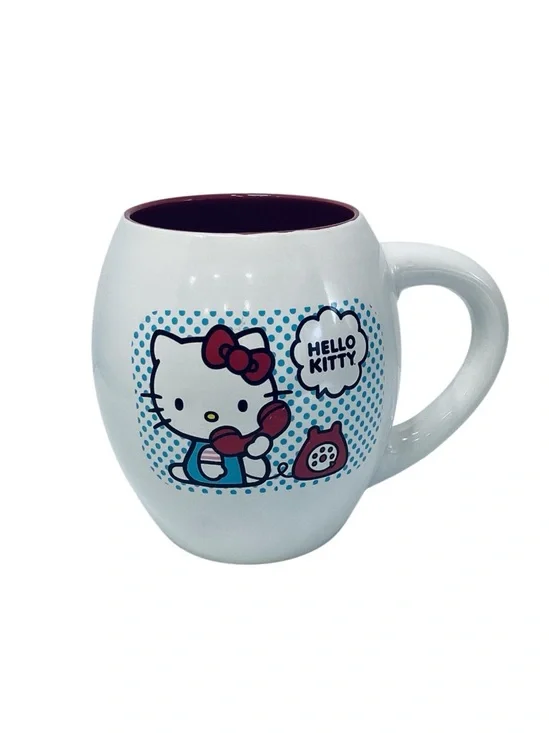 Playful Hello Kitty graphic on a white ceramic mug. Red interior and matching red bow and phone details. Blue dotted background accent around the character. Comfortable handle and rounded shape.