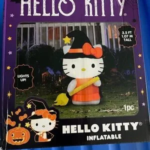 3.5 ft Hello Kitty inflatable in a witch costume. Features a broom and lights up for Halloween decor.