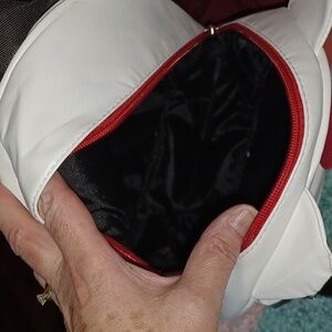 This is a brand new PU leather backpack. The leather is so supple and soft to touch. The red bow and little ears give the bag a unique, attractive look. The red zipper pull is made of silicone, I believe.