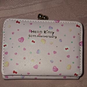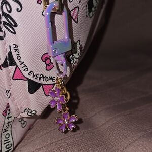 This is a clash of anniversaries!The 40th anniversary bag meets the 50th anniversary wallet and I think they compliment each other nicely. The backpack would be considered to be a mini. It is a great purse or casual bag for your essentials. The front pouch fits the wallet perfectly. I placed a brooch on the back of the backpack because the pink outfit Hello Kitty was wearing matched beautifully! I went a little crazy and made a couple of zipper pulls featuring pretty purple flowers. The wallet is really well made and just so pretty. Perfect for fans and collectors.