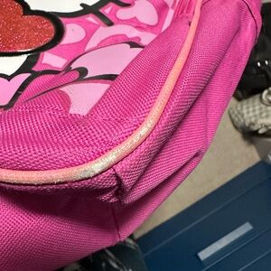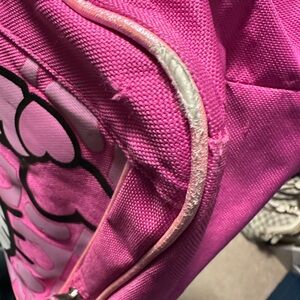 Cute Hello Kitty backpack. Features pink and white design. Heart patterns add charm. Very good condition