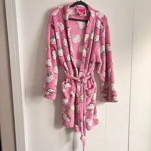 Cozy pink robe with Hello Kitty design. Features a tie belt and long sleeves.