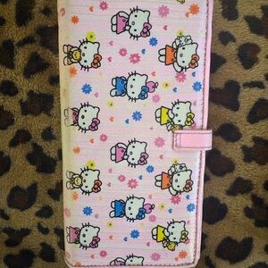 Cute Hello Kitty wallet with colorful design. Features pink background with Hello Kitty print.