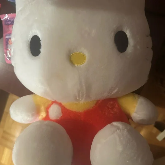 Charming Hello Kitty plush with a delightful red and yellow outfit.