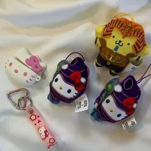 Set of Hello Kitty plush keychains in vibrant colors. Includes pink, purple, and orange designs. Includes iPhone hello kitty case