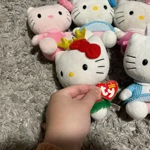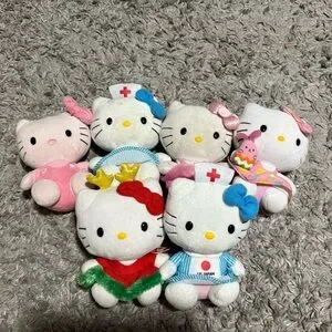 Charming Hello Kitty plush set with nurse and holiday themes. Features pink, white, and blue accents. Ideal for Hello Kitty fans.