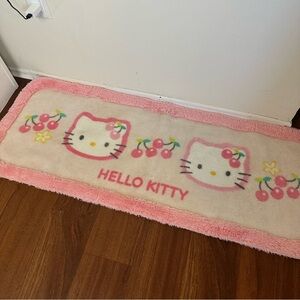 Charming Hello Kitty rug. Features pink border and cream center. Adorned with cherries and flowers. Perfect for adding a cute touch.