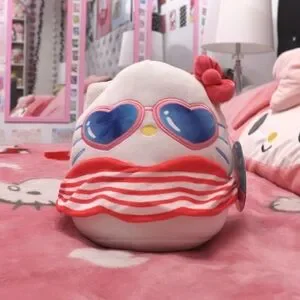 Charming Hello Kitty plush with pink heart-shaped sunglasses. Features a red striped outfit. Great for fans and collectors. NWT.