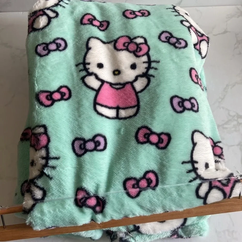 🎀 Adorable Hello Kitty fleece throw blanket featuring a playful allover print with pink & mauve bows on a soft mint green background. Ultra soft faux fur feel—perfect for cozy nights, gifting, or adding a cute pop to any room.