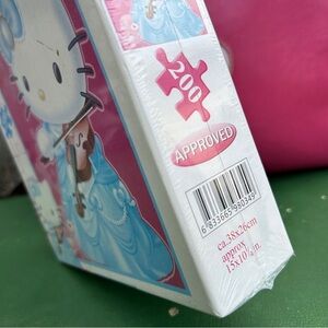 Charming Hello Kitty puzzle with a violin theme. Features vibrant pink and blue colors. Perfect for young fans.