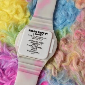Press the face of the watch to display the time. Plastic case backing & band. Hello Kitty is printed all over the front of the watch.