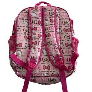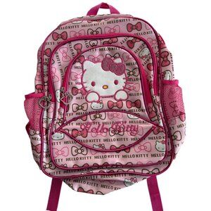 Sure to be a hit with Hello Kitty fans of all ages, this Hello Kitty backpack set makes a great gift for anybody who loves Hello Kitty and pairs perfectly with all other Hello Kitty merchandise. Features a prominent image of Hello Kitty on the main front pocket, along with an all-over print of "Hello Kitty" text and various pink bows. A standard school-style backpack with a main compartment, a large front zip pocket, and mesh side pockets, suitable for holding water bottles or small items. The backpack includes padded shoulder straps for comfort and a top handle for easy carrying.