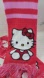 Cozy red knit long winter scarf featuring Hello Kitty pattern design and pink strips. Adorned with playful fringe.