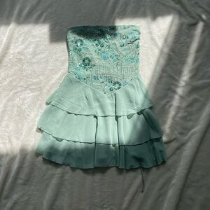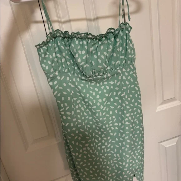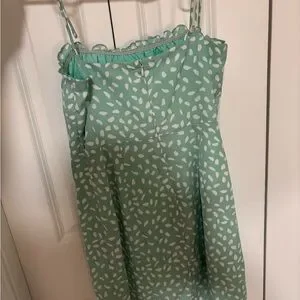 Chic mini dress with a playful pattern. Features adjustable straps and a ruffled neckline. Perfect for casual outings. Worn once like new.