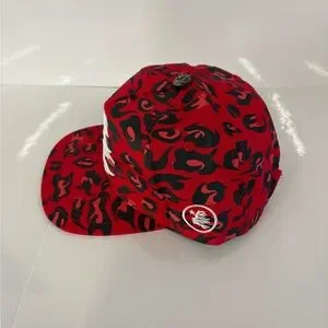 Stylish red and black patterned hat with a unique design. Perfect for adding a bold touch to any outfit.