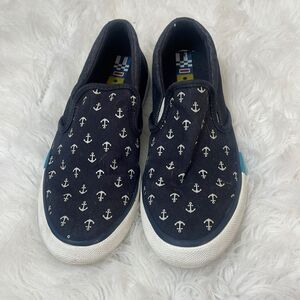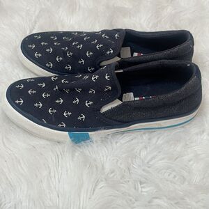 Dark blue loafers with white anchor pattern. Easy slip-on design. Perfect for casual wear.