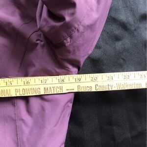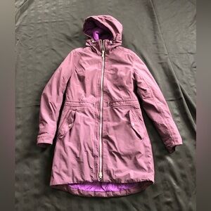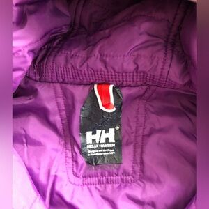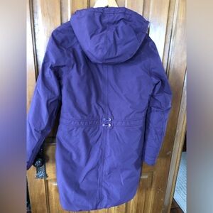 Purple longer length jacket from Helly Hansen. Good winter coat for the warmer winter days that you don’t want to wear a big bulky coat. Fits like a small, I can’t find a size tag. Adjustable waist elastic, two outside pockets on each side. One of each has a clasp.