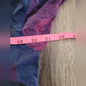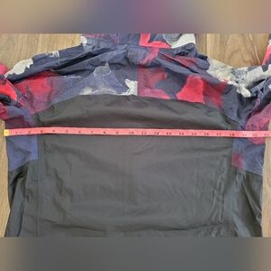 Stylish jacket with a navy base and pink accents. Features a hood and full zip closure. Ideal for winter sports.