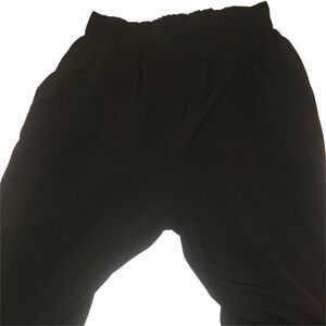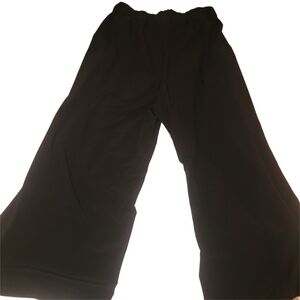 Stylish wide-leg black cropped culotte style pants. Pleated detailing at waistline with belt loops. Has 2 side slant pockets.