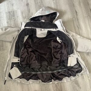 The hood is removable. There is a bit of an elastic on the back cinching in the waist as you can see in the photos, and there are various snaps inside the coat to keep you warm between your snow pants and the coat.