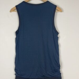 High quality material. Short length, sleeveless. Ribbing at neck and arm holes. Front is beautifully draped in super soft cashmere in blue called Celeste. The bottom half is a straight skirt with pockets and faux wrap.