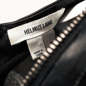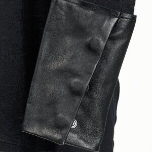 Circa 2013, this top from Helmut Lang is crafted in a black heathered wool and angora-blend jersey, and is adorned with a tonal leather throughout. It features long sleeves, snap closure leather cuffs, a crew neckline, and a back zip closure.
