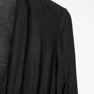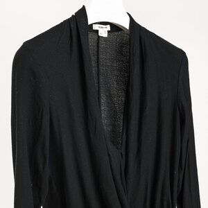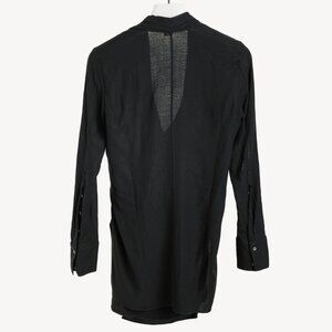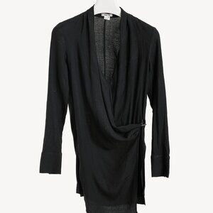 Circa 2015, this top from Helmut Lang is crafted in Black crepe, and features long sleeves with buttoned cuffs, a V-shaped neckline, a draped fabric wrap on the front with a metal toggle closure, and side slits.
