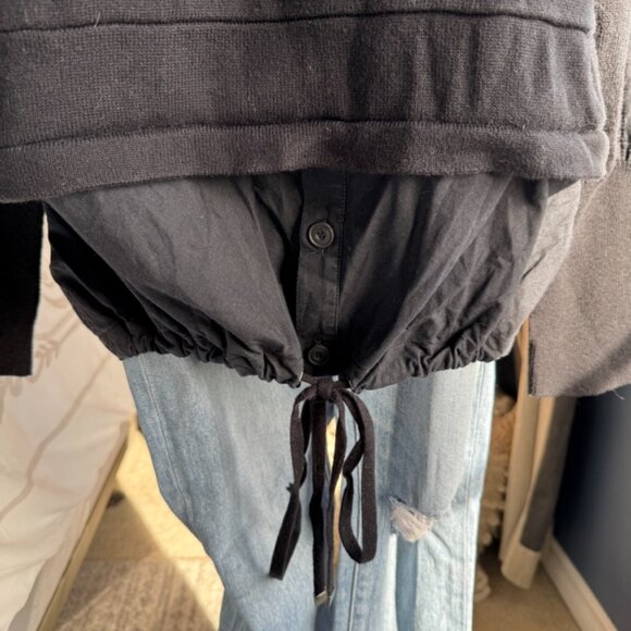 Helmut Lang black sweater with illusion shirt underneath, hood, arm panels, and button down bottom of sweater are shirt material. Size M, 80% wool, 17% cotton, 3% cashmere. Great used condition. Chest measures 22 inches laying flat, length from shoulder to hem is just over 31 inches. Shown on female mannequin. Cat friendly, nonsmoking home.