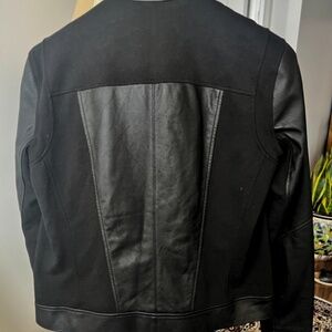 Helmut Lang100% lamb leather and viscose biker jacket. Worn only twice and in excellent condition. No tears, rips, smells, etc. Hangs beautifully as more of a straight cut rather than fitted. Purchased from Net-a-porter. It is comfortable and the viscose has a bit of a stretch which makes it easy to layer clothes under. Style: SW-JK0523H Style #: E02HWIII
