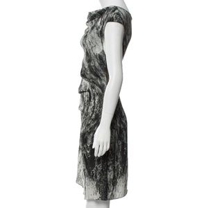 Helmut Lang black and white silk dress. Short sleeve, cowl neck, exposed side zipper and side ruching which provides an elegant drape. Perfect dress for casual wear or more upscale. Purchased at Bloomingdales in Boca Raton, FL. Never worn. PERFECT, NEW CONDITION