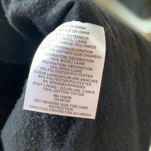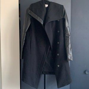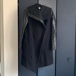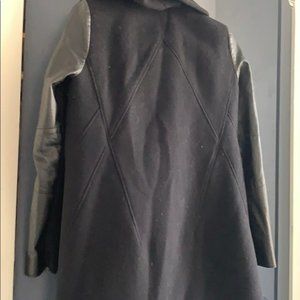 Wool Coat with leather sleeves. Decorative seaming on back, button closure, pockets. Funnell collar can be worn up or down. Barely worn, excellant condition. Size P- fots xs or s.