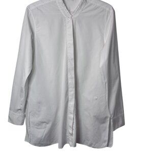 The Helmut Lang Cotton Poets Blouse is a meticulously crafted, oversized white blouse known for its soft cotton material and elegant details. Features a beautiful ruff-edge hem along the collar. Designed with an elegant hidden button closure down the front. Cut in an oversized silhouette, providing a relaxed and comfortable fit.