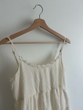 Soft cream sundress with thin straps. Ruffled trim along neckline and bodice. Feminine tiered look and light fabric. Easy-to-wear casual style.