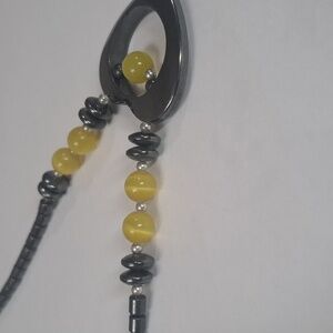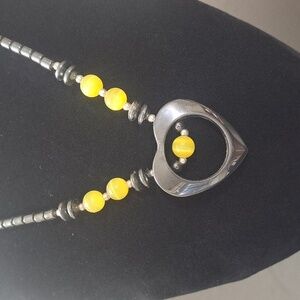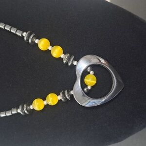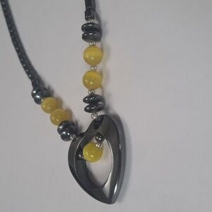 Hematite Heart Pendant Necklace with Yellow Cats Eye Beads