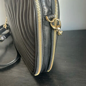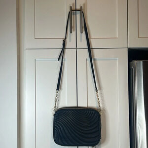 Elegant black crossbody bag with gold accents. Features a sleek, wavy design. Perfect for any occasion.