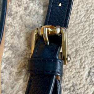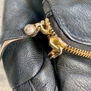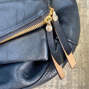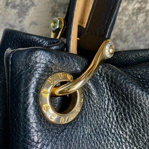 Henri Bendel oversized slouchy shoulder bag, black pebble leather with gold and silver hardware. Pockets on outside of bag as well as pretty purple organizational pockets in interior. Has a few scuffs, makeup marks inside, leather toggle missing from the left outer pocket (but still functions of course), and the screw on the base of the back left strap has been replaced with a non-logo'd one. Cat friendly, nonsmoking home.