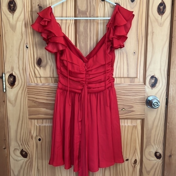 Featuring ruffle detailed shoulders, a silky feel, pleated waist with tie up sash, a string tie up open back and a zip up closure.