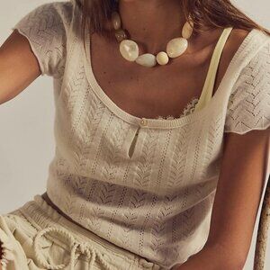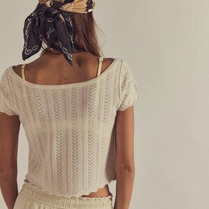 The definition of delicate, this sweet short-sleeve sweater tee is featured in a so-special cashmere knit with a pointelle finish for the perfect femme touch. Color is Cloud Dancer. Size L.