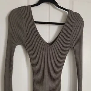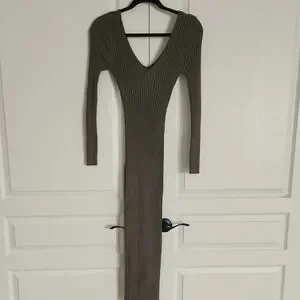 Figure-hugging ribbed midi/maxi dress with a V-neck in neutral olive color. Long fitted sleeves and vertical rib detail create a sleek silhouette. Stretch knit fabric for comfortable wear.