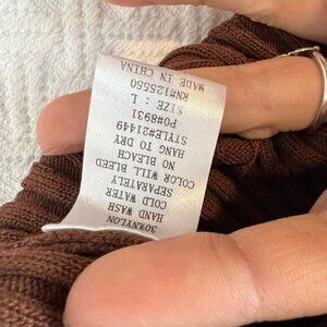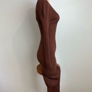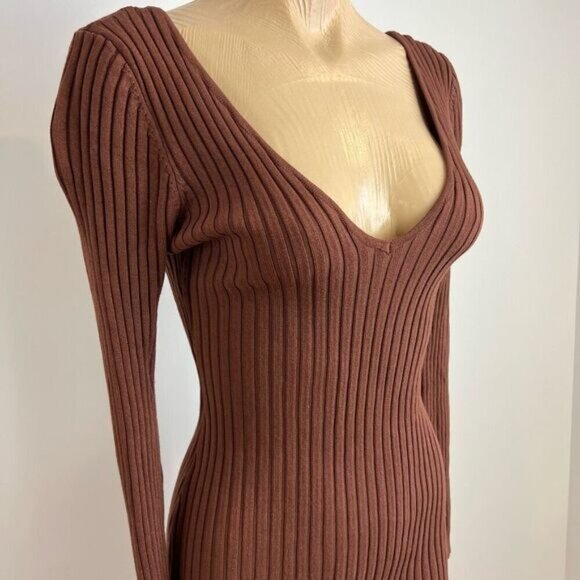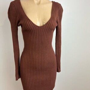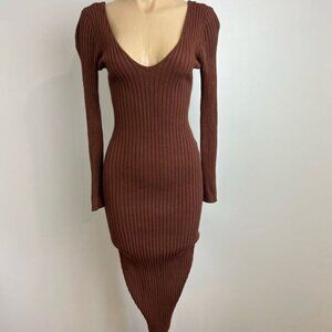 Hera Collection Women’s L Brown Knit Sweater Bodycon Dress Ribbed V Neck Plunge