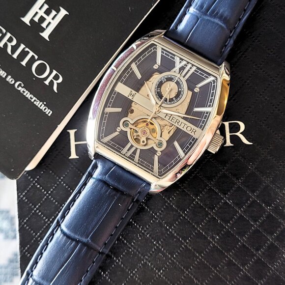 Heritor Men's Automatic Rectangle Silver Blue Leather Watch