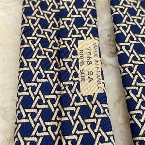 Gorgeous authentic Hermes 100% silk tie in striking geometric pattern. Rich dark blue with tan/beige print. Classic, elegant and timeless.