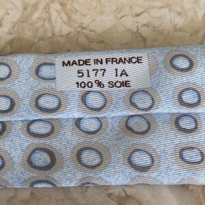 Authentic Hermes tie in 100% silk featuring a creative twist on the polka dot motif, gorgeous baby blue, the circles are grey and tan. 3.5” wide, this luxuryntie is in excellent preowned condition and will make your formal suit really stand out.