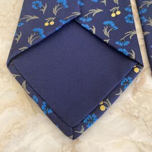 The tie is 3.5” wide and features a rich, deep blue that exudes elegance and style, with lighter blue, green and yellow sprinkled throughout the all over print.