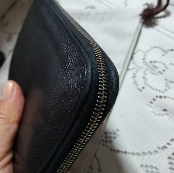 The interior is lined with black epsom and has 12 credit card slots with a middle zip compartment.