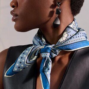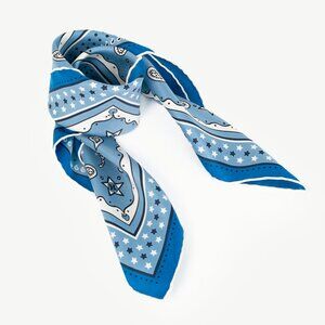 Made in France, this Bandana 55 scarf from Hermes is crafted in a luxurious silk twill, and features the Le Rodeo Des Fruits print designed by Shinsuke Kawahara in hues of Bleu Jean, Marine, and Blanc. Finished with hand-rolled edges, it's a simple and modern accessory perfect for wearing in your hair or around your neck.
